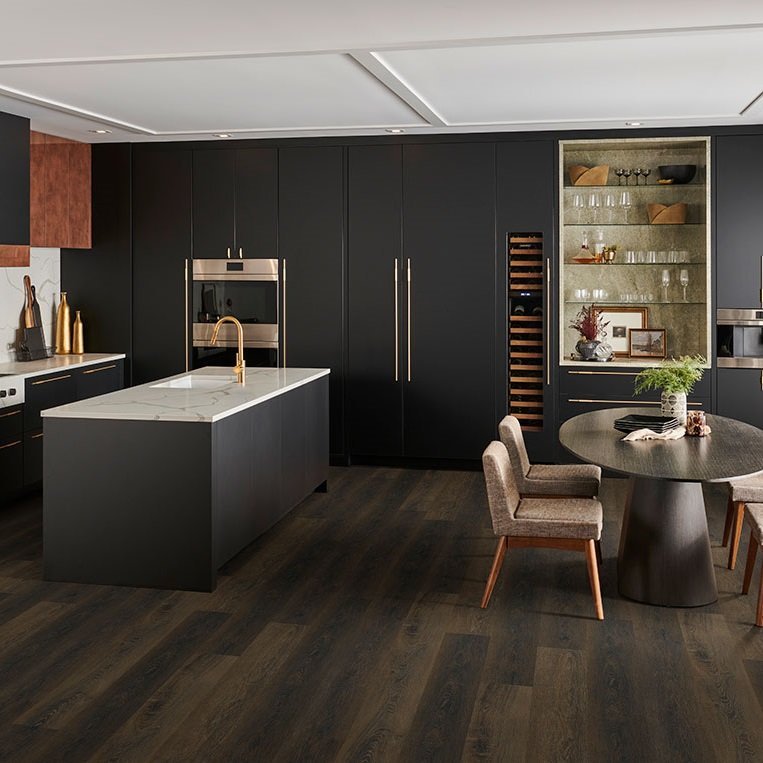 MSI SURFACES LUXURY VINYL, VINYL PLANK Barrell Luxury Vinyl Planks offer dark chocolate brown tones which resemble gorgeous aged walnut hardwood. This beautiful 7×48 wood-look vinyl flooring is 100% waterproof that’s backed by a lifetime residential warranty for added peace of mind. As part of the Cyrus Collection, it features an MSI exclusive CrystaLux™ protection layer, providing durability and longevity, protecting against everyday wear. Its innovative pre-attached backing ensures supreme comfort underfoot, while its easy-install locking system makes these vinyl planks DIY-friendly. This rigid core flooring features “no acclimation” technology that enables buy today, install today convenience. In the kitchen, living area, bathroom, basement and beyond, there’s no easier way to create luxurious, affordable, low maintenance floors than with LVP Flooring. Find coordinating vinyl plank flooring trim pieces below. Available trim items include end caps, stair noses, reducers, and T-molding.