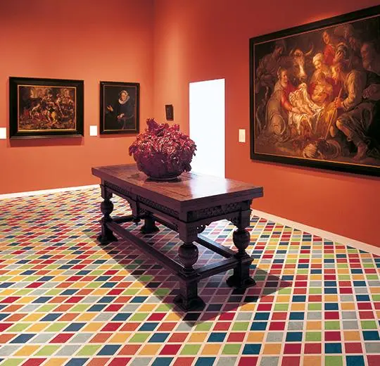 In close cooperation with the Italian architect and designer Alessandro Mendini we have created 3 unique Marmoleum designs that reflect his pointillist style: Proust, Harlekino and Plato. The 3 designs are available in a bright, contrasting variant and one of more subdued, greyish tones, both in the same geometric pattern.